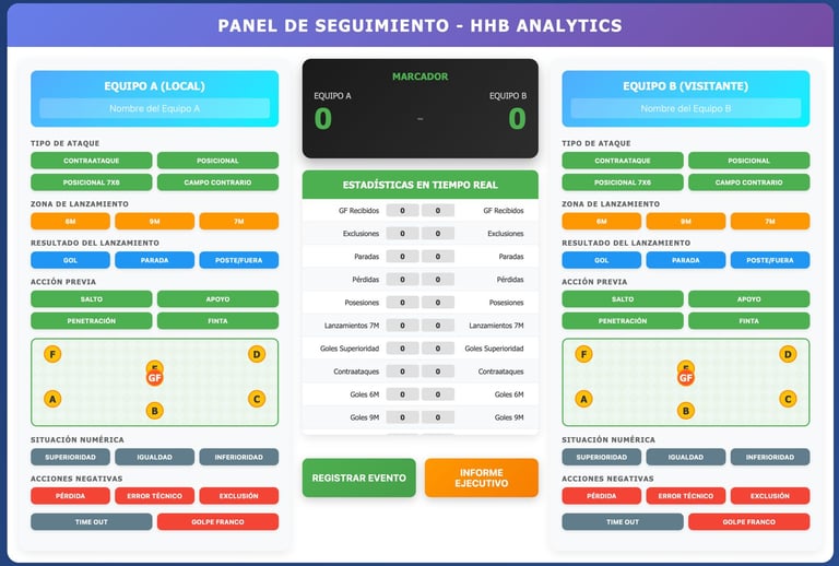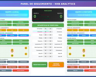 De esa necesidad nace hhb analytics. Nuestra herramienta está diseñada para que, desde una tablet u ordenador, los entrenadores puedan anotar estadísticas de manera rápida e intuitiva, con paneles preestablecidos para diferentes situaciones de juego. Al finalizar, se genera automáticamente un informe en PDF con todos los datos recogidos, listo para compartir, archivar o utilizar en un análisis posterior.