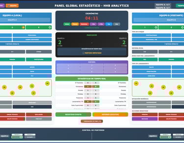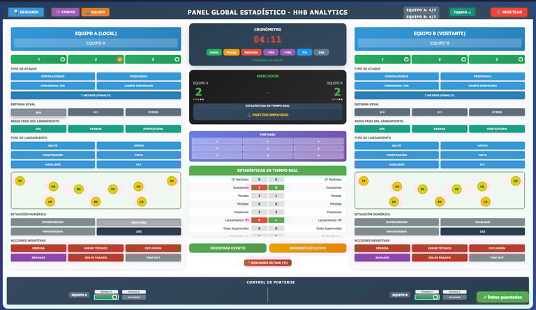 Goles / Lanzamientos / Efectividad / Golpes francos recibidos / Lanzamientos campo contrario / Time Out / Eficacia en el contraataque / Eficacia en ataque posicional / Eficacia Campo contrario / Perdidas de balon / Pasos-dobles / Pisar linea / Exclusiones
